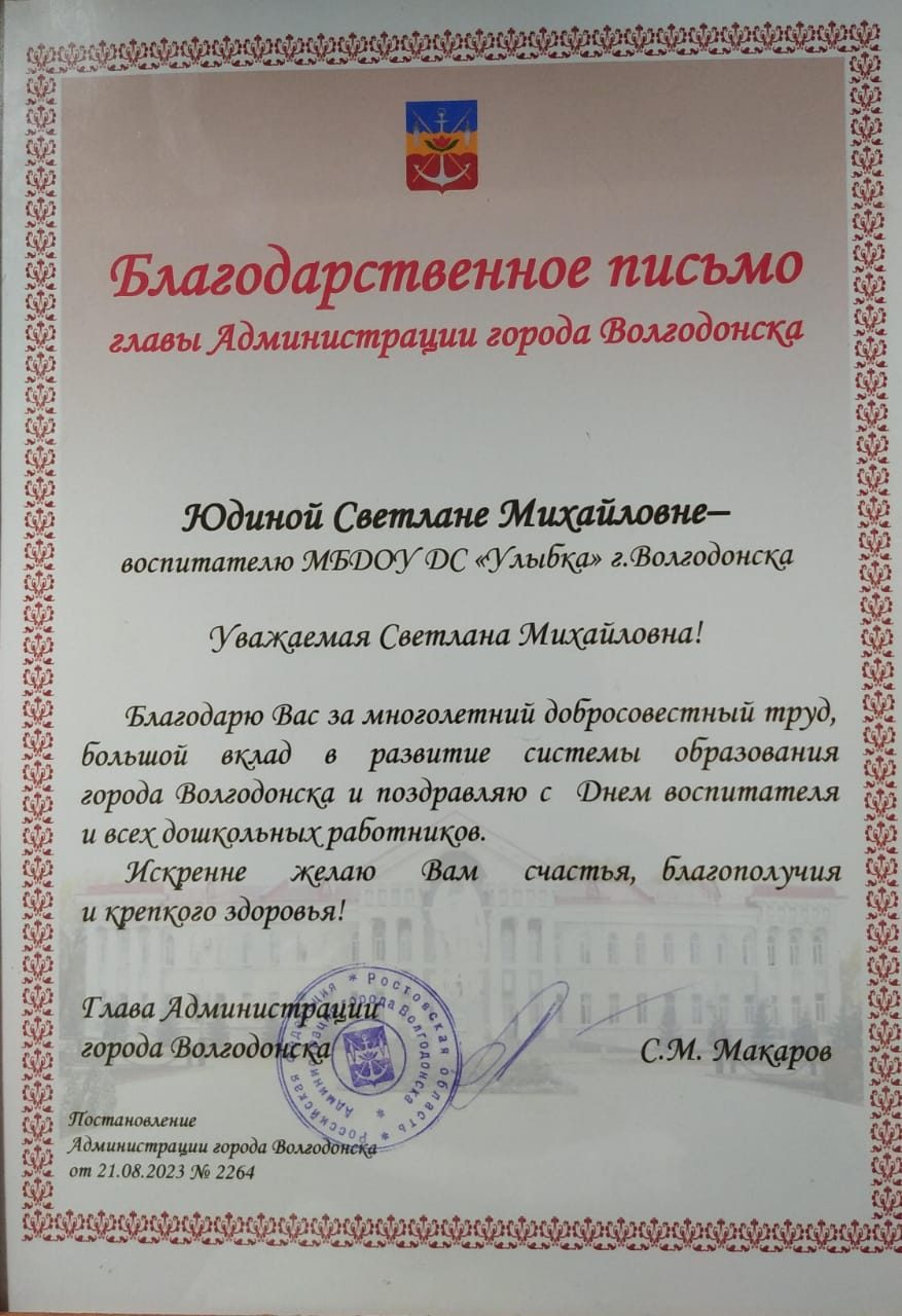 Благодарственное письмо главы Администрации города Волгодонска за многолетний добросовестный труд и большой вклад в развитие системы образования города Волгодонска.