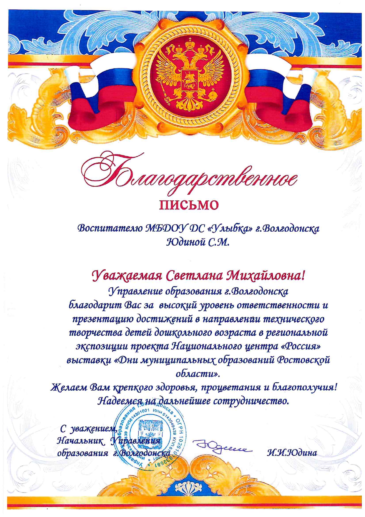 Благодарственное письмо за высокий уровень ответственности и презентацию достижений в направлении технического творчества детей дошкольного возраста в региональной экспозиции проекта национального центра "Россия" выставки "Дни муниципальных образований Ростовской области"