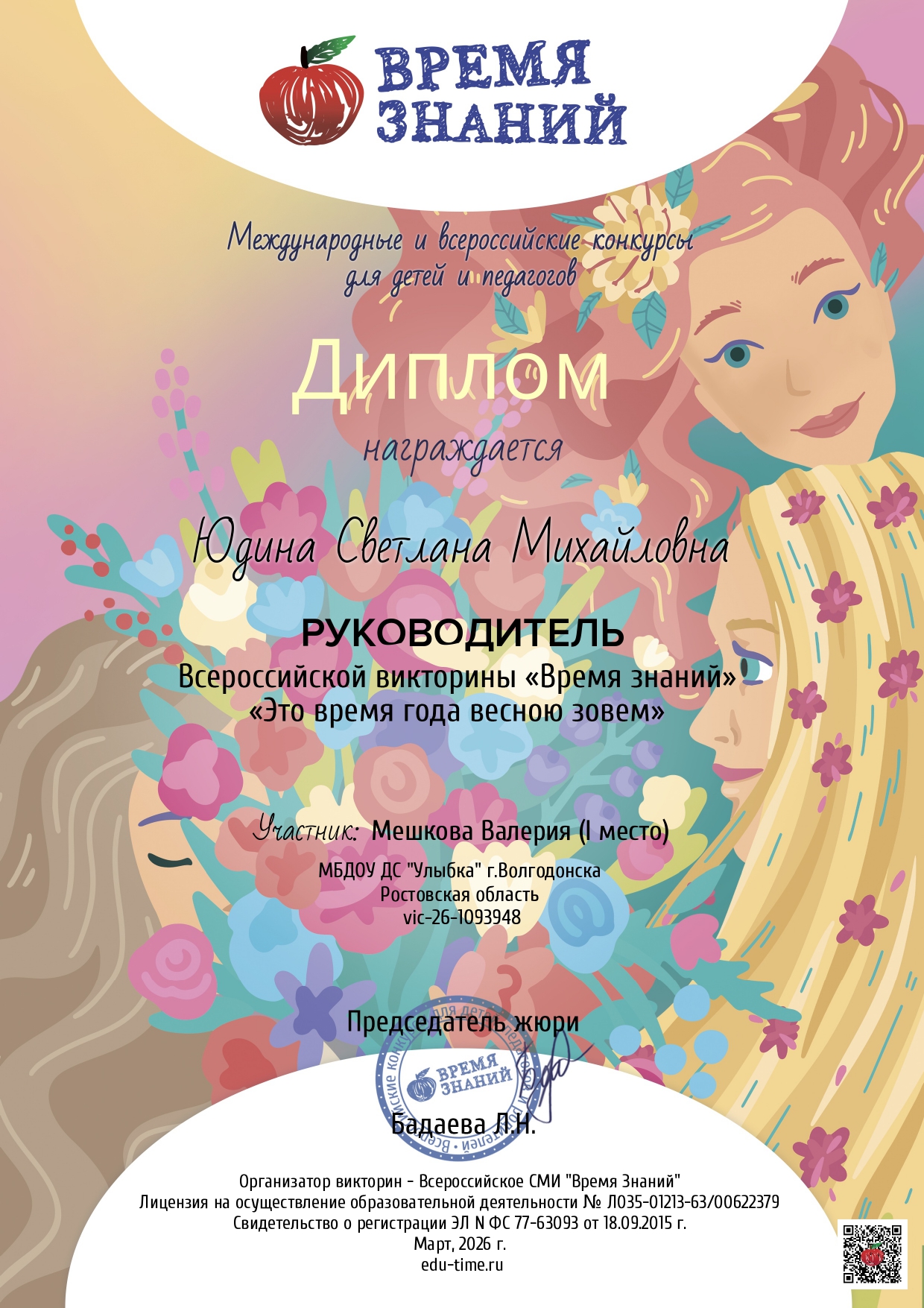Диплом руководителя за организацию и проведение всероссийской викторины «Время знаний» «Это время года весною зовём» , организованной Всероссийским СМИ «Время знаний».