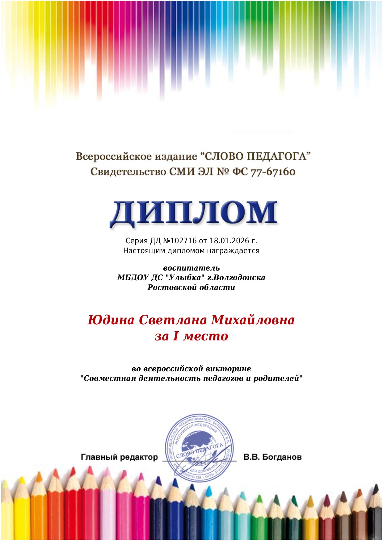 Всероссийская викторина «Совместная деятельность педагогов и родителей» , организованная сетевым изданием «СЛОВО ПЕДАГОГА», диплом победителя 1 место, 18.01.2026 г.