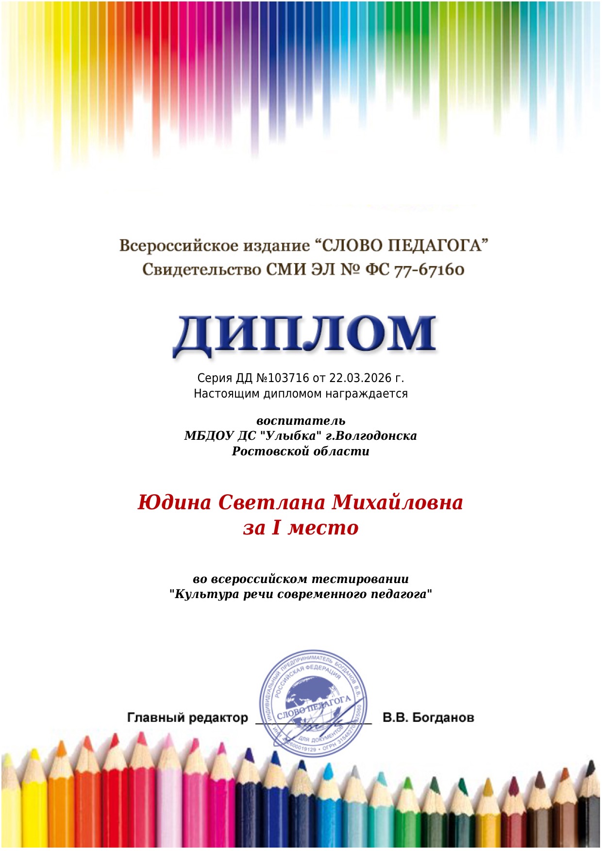 Всероссийское тестирование «Культура речи современного педагога» , организованное сетевым изданием «СЛОВО ПЕДАГОГА», диплом победителя 1 место, 22.03.2026 г.