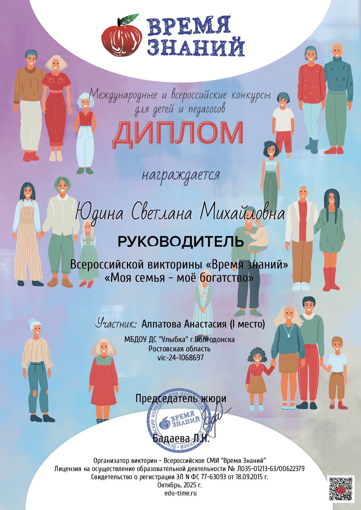Диплом руководителя за организацию и проведение всероссийской викторины «Время знаний» для дошкольников «Моя семья – моё богатство», организованной всероссийским СМИ «Время Знаний» 09.10.2025