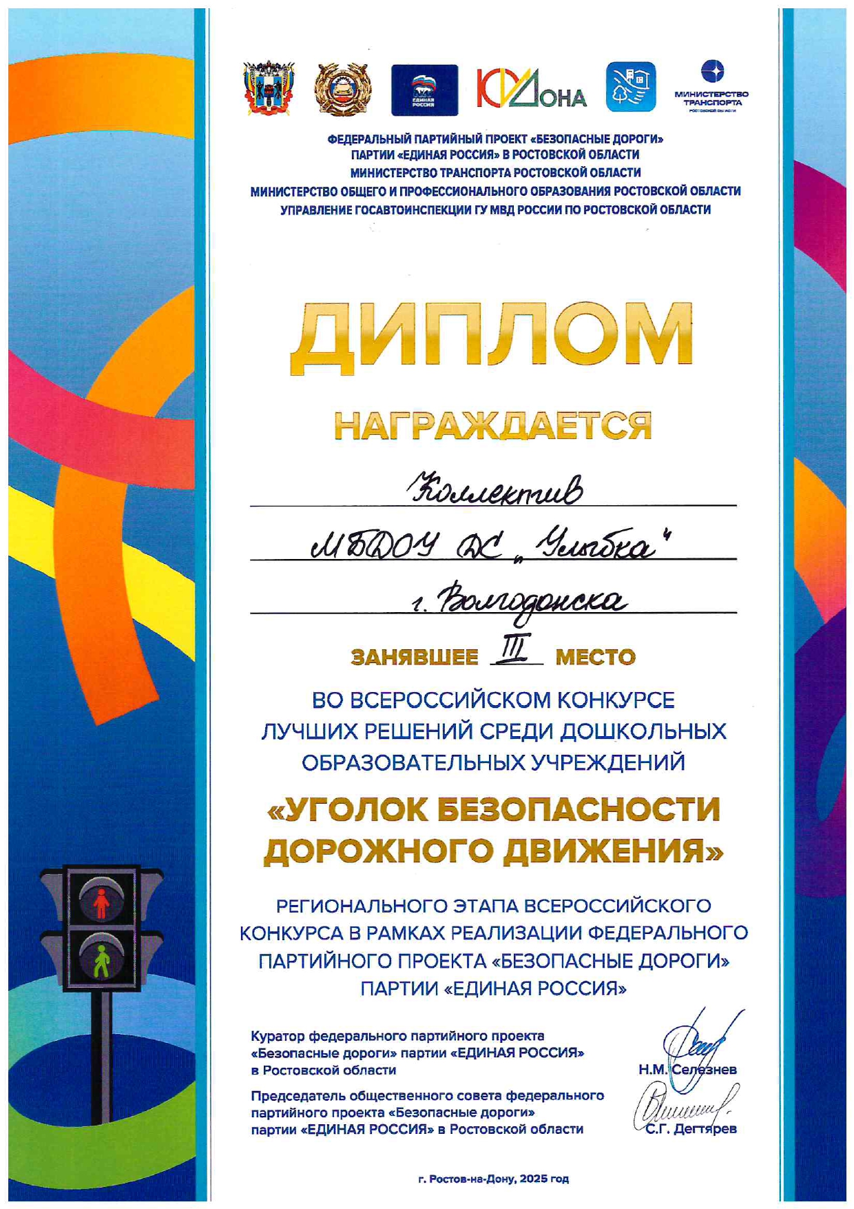 Диплом победителя 3 место в региональном этапе всероссийского конкурса лучших решений среди дошкольных образовательных учреждений «Уголок безопасности дорожного движения» в рамках реализации федерального партийного проекта «Безопасные дороги» партии «Единая Россия»