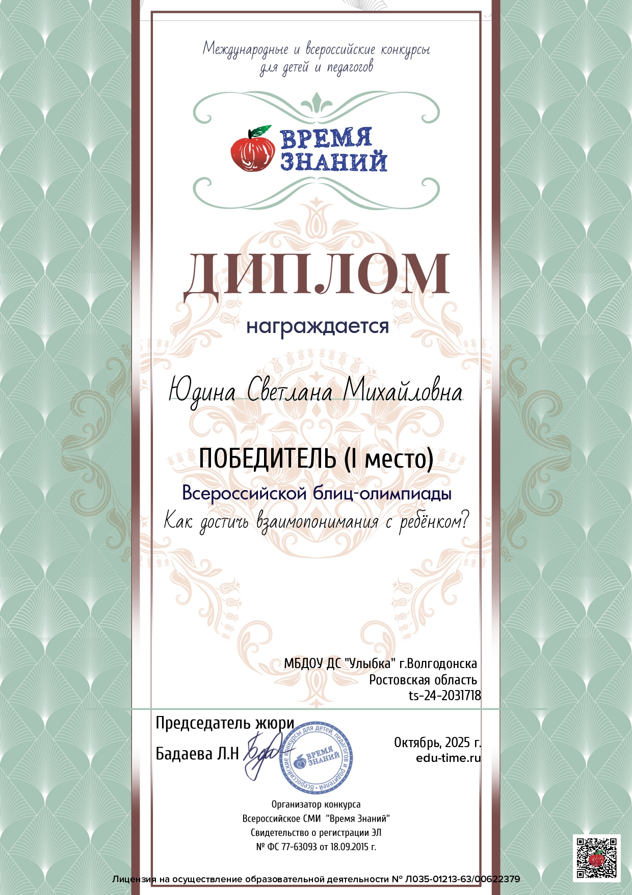 Всероссийская блиц – олимпиада «Время знаний» «Как достичь взаимопонимания с ребёнком?», проводимая Всероссийским сетевым изданием «Время знаний » - диплом победителя 1 место 14.10.2025г. , с целью повышения своей компетентности в данном вопросе;