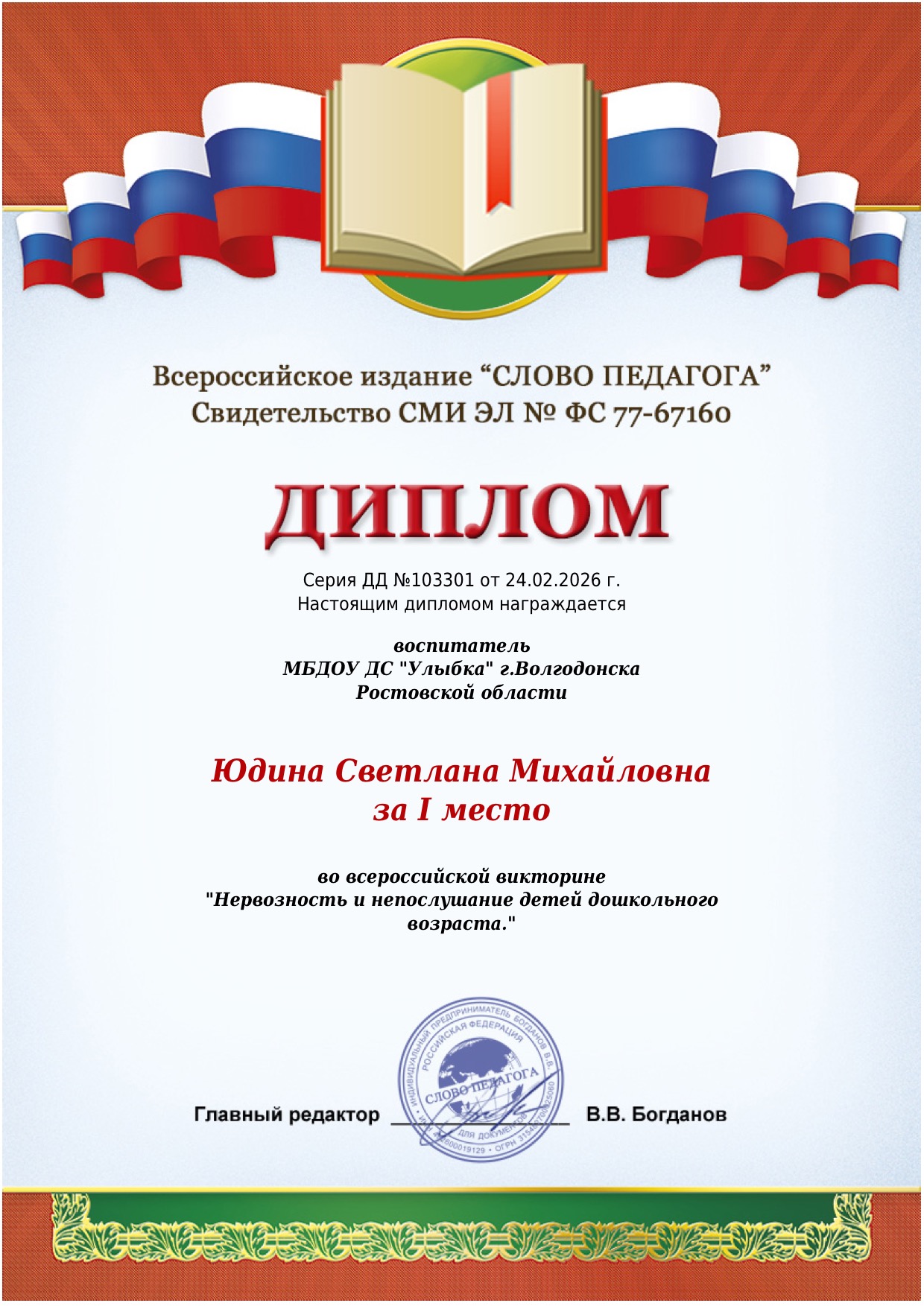 Всероссийская викторина «Нервозность и непослушание детей дошкольного возраста» , организованная сетевым изданием «СЛОВО ПЕДАГОГА», диплом победителя 1 место, 24.02.2026 г.