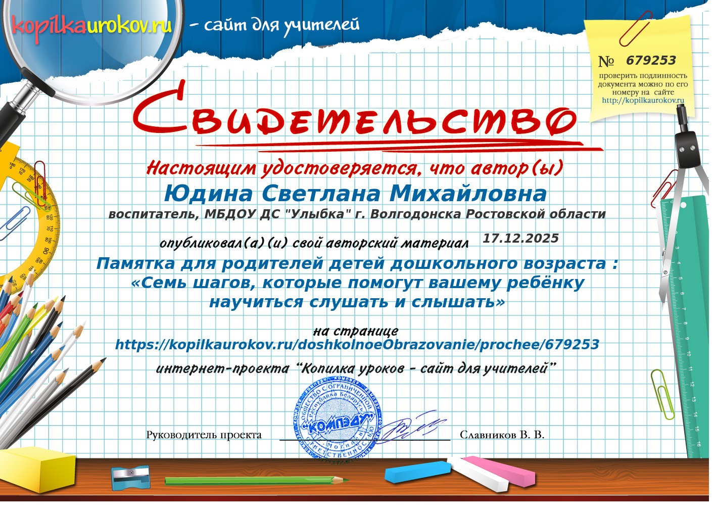 Свидетельство о публикации